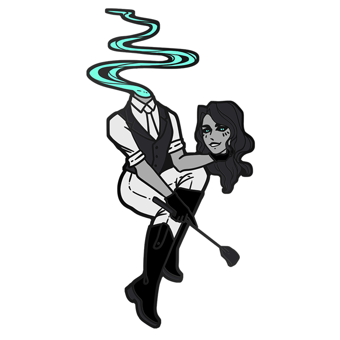 Pinup style enamel pin featuring a Dullahan, also known as the Headless Horseman! He is from my original Cryptid Crushes enamel pin set.